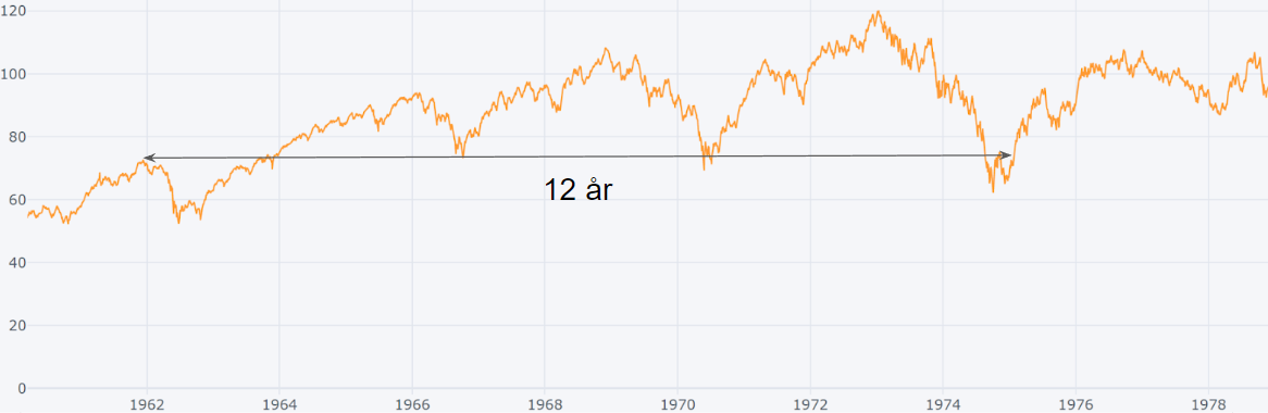 För att buy and hold ska fungera över tid måste man ha just det, tid. Nedan ser vi exempel på tidsperioder då S&P 500 inte har givit en nominell avkastning.