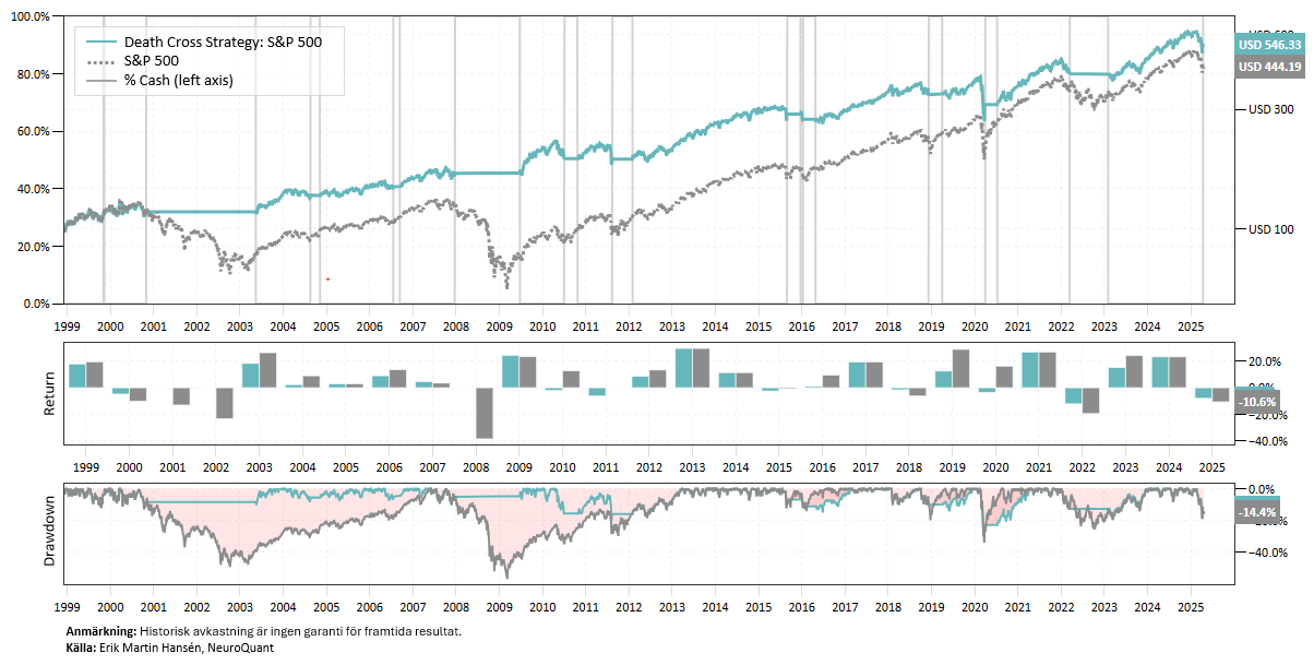Sammanfattningsvis finns det ingen anledning att låta sig skrämmas av en death cross-signal. Visst är det positivt att strategin stod utanför två längre björnmarknader – men det gör alla signaler som fångar upp långsiktiga trender. Med en Sharpe-kvot på endast 0,49 vet vi att det finns betydligt bättre metoder för att hantera risk och tajming.