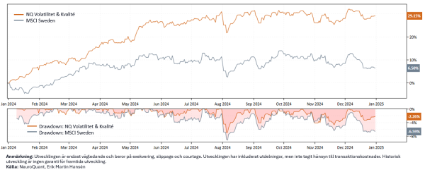 Strategin levererade en avkastning på 29 % under 2024 med en Sharpe-kvot på 1,9, en volatilitet på 11,8 %, en korrelation mot Stockholmsbörsen på 0,69 och en tracking error på 10,4 %.