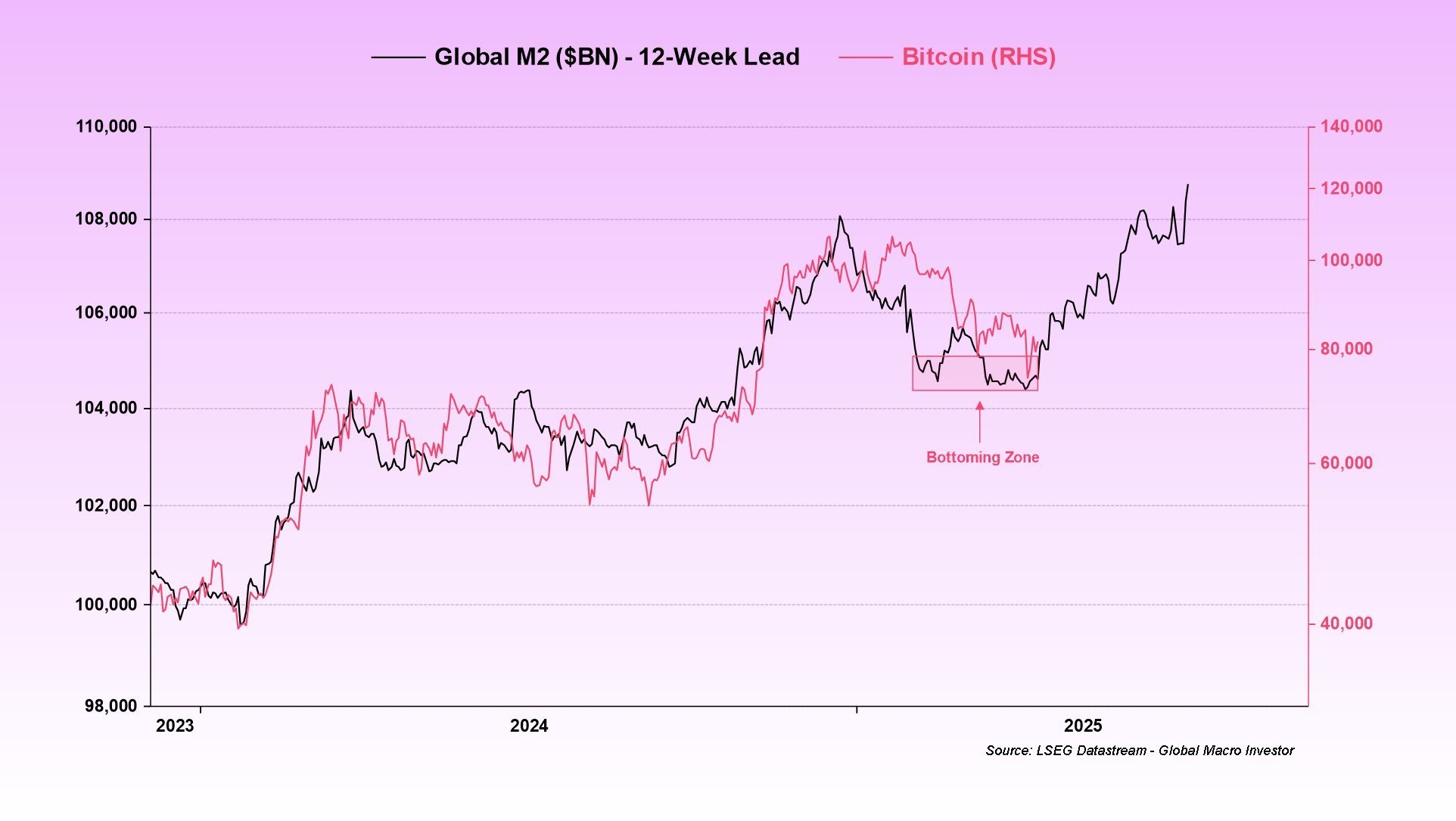 Ett exempel som just nu cirkulerar är en graf där bitcoin tycks följa den globala penningmängden (Global M2) med exakt 12 veckors fördröjning.
