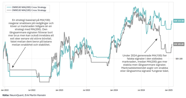 En strategi som använder MA(100) kom ur marknaden snabbare vid börsfallet 2022 jämfört med en strategi som använder långsammare signal som exempelvis MA(200).