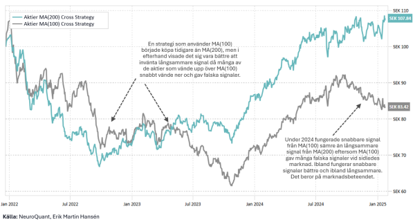 Under 2024 fungerade snabbare signal från MA(100) sämre än långsammare signal från MA(200) eftersom MA(100) gav många falska signaler vid sidledes marknad. Ibland fungerar snabbare signaler bättre och ibland långsammare. Det beror på marknadsbeteendet.