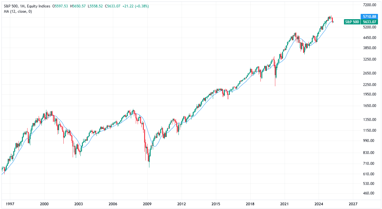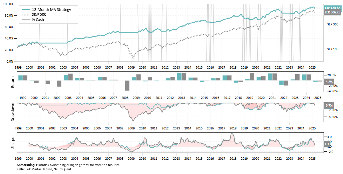 Det intressanta med just S&P 500 och det 12-månaders glidande medelvärdet är att denna enkla trendföljande signal faktiskt fungerat förvånansvärt bra historiskt. Det beror inte på magi eller att marknaden alltid “respekterar” snittet, utan på att S&P 500 genom åren haft en tendens att gå in i tydliga och ibland långvariga trender. Många björn- och tjurmarknader har varit just sådana – utdragna och kraftfulla – vilket är exakt det som en trendföljande modell behöver för att fungera.