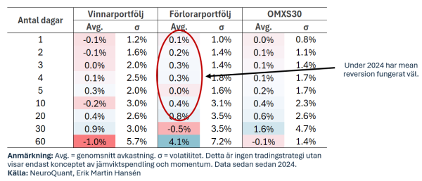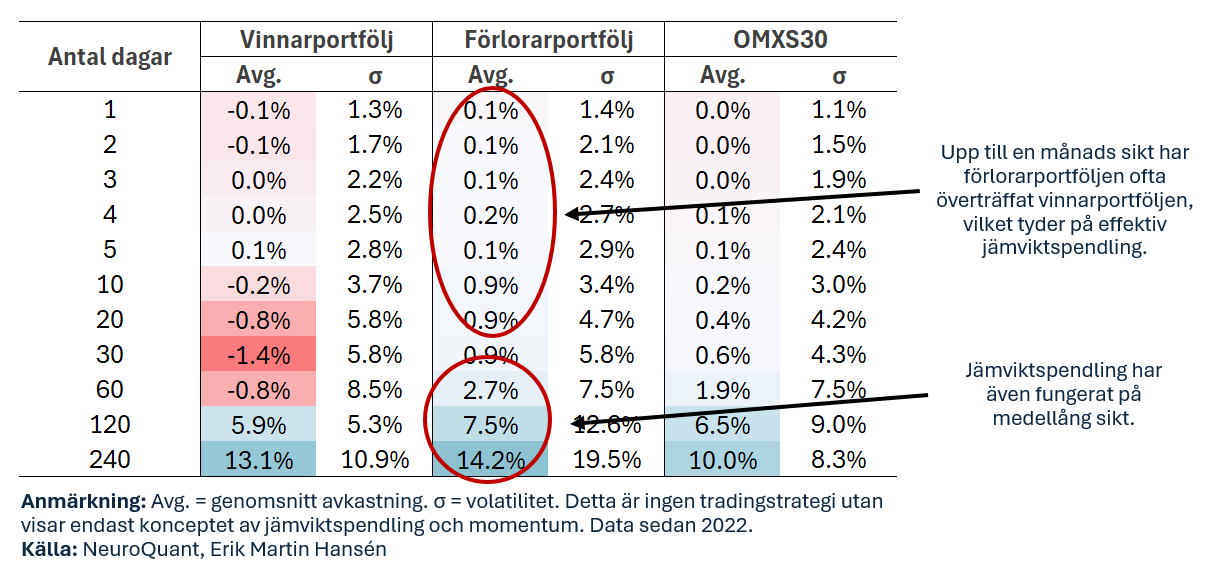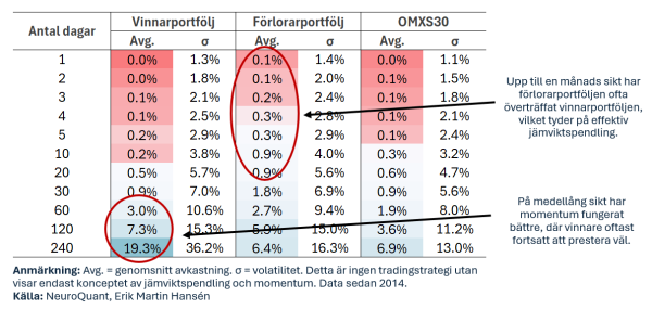 Resultaten i tabellen visar att aktier har en tendens att jämviktspendla på kort sikt, upp till cirka 30 dagar. Det innebär att portföljen med svaga aktier generellt presterat bättre än portföljen med starka aktier på dessa tidsramar. Efter 30 dagar börjar dock momentum-effekten ta över, vilket innebär att vinnarportföljen överträffar förlorarportföljen.