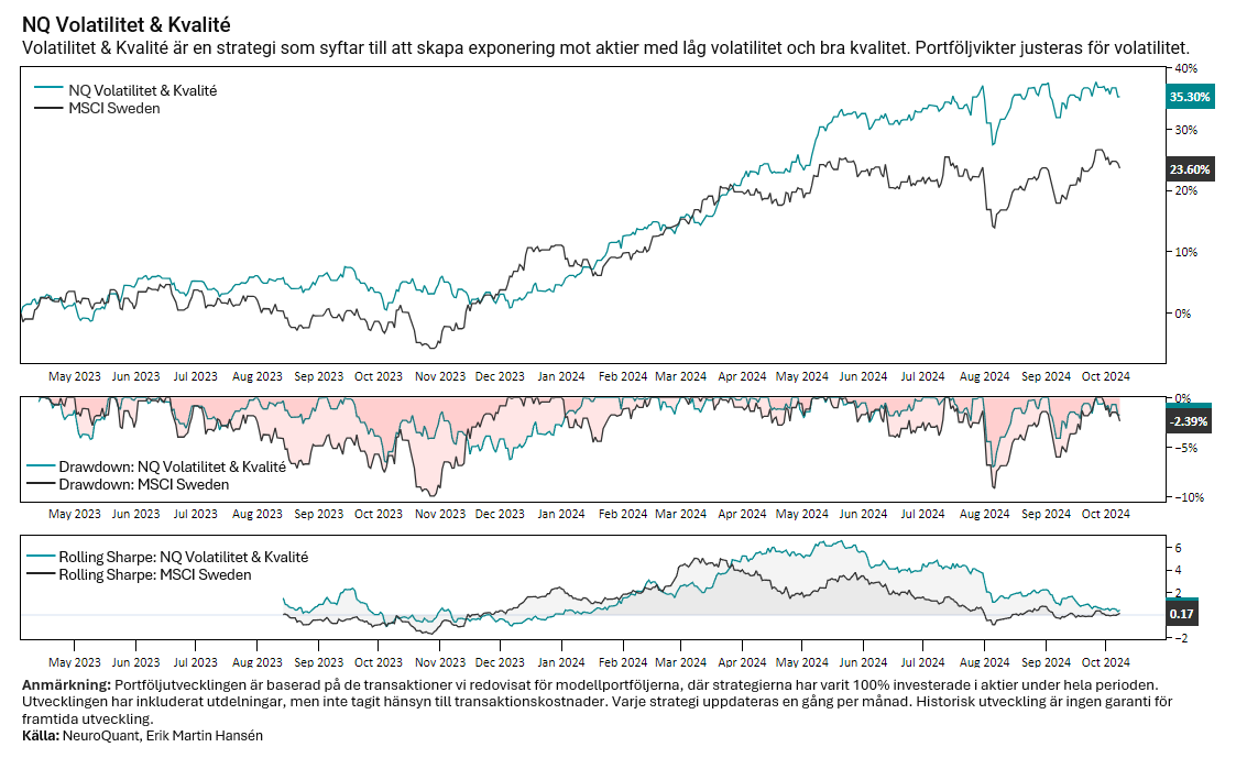 Senaste månaden har Volatilitet & Kvalité stigit med 4,8%, vilket är lite högre än Stockholmsbörsens som stigit med 2,6%.