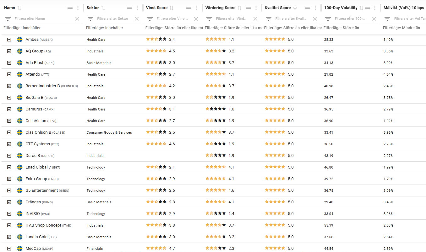 På plattformen kan vi exempelvis sortera aktierna efter kvalitet där bedömningen baseras på lönsamhet, skuldsättning, vinstkvalitet och utdelning. Bolag som uppvisar höga marginaler och stark avkastning på kapitalet, kombinerat med låg skuldsättning, god vinstkvalitet och en växande utdelning, ges ett högre betyg. Bolag utan utdelning straffas inte, då fokus främst ligger på långsiktiga fundamentala faktorer som indikerar finansiell stabilitet och kvalitet.