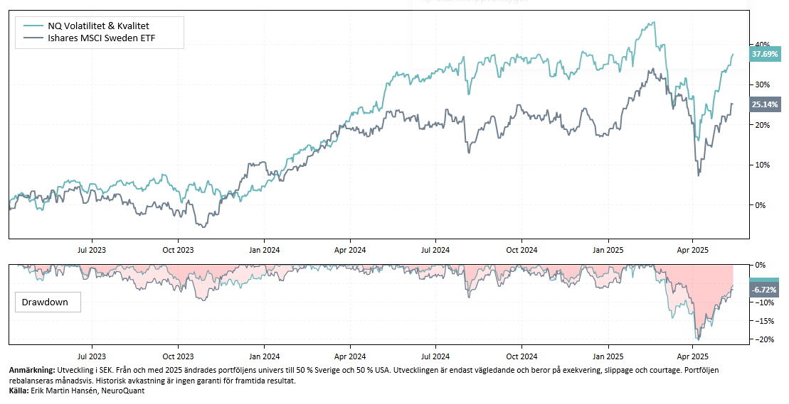 Sedan starten april 2024 har portföljen avkastat 38 %, att jämföra med Stockholmsbörsens 25 %. Sharpekvoten har legat på 1.0 jämfört med 0,5 för Stockholmsbörsen. Volatilitet har varit 11,9 % och tracking error mot Stockholmsbörsen uppgår till 13 %. Observera att strategin ändrade sitt univers inför 2025 och idag allokerar 50 % av kapitalet till USA.