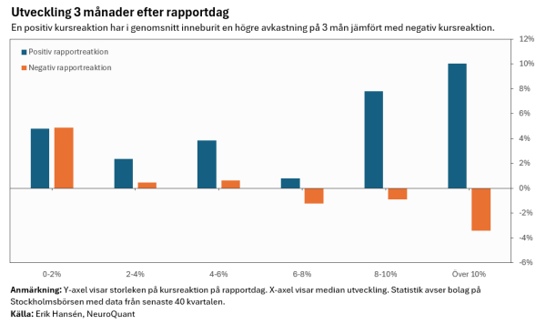 Effekten är särskilt stark för bolag som har haft en kraftig kursuppgång i samband med en rapport – dessa tenderar ofta att fortsätta stiga under de följande tre månaderna.