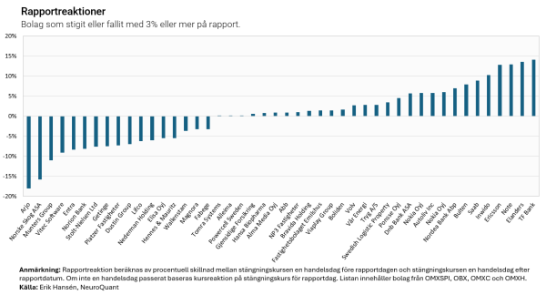 Nedanför ser vi bolag som stigit eller fallit med 3% eller mer på rapport. Jag har inkluderat bolag från OMXSPI (Sverige), OBX (Norge), OMXC (Danmark) och OMXH (Finland).