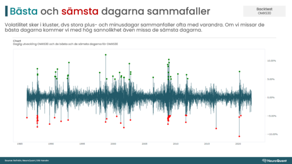Men hur rimligt är det att vi endast skulle missa de bästa dagarna och inte även missa de sämsta dagarna? Vad Benoit Mandelbrot uppmärksammande och som vi också noterat är att volatilitet klustrar. De bästa dagarna brukar sammanfalla med de sämsta dagarna.