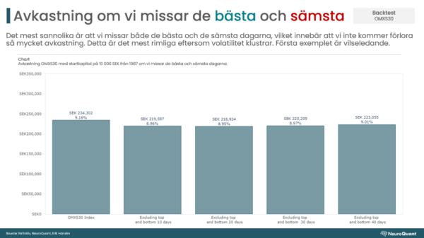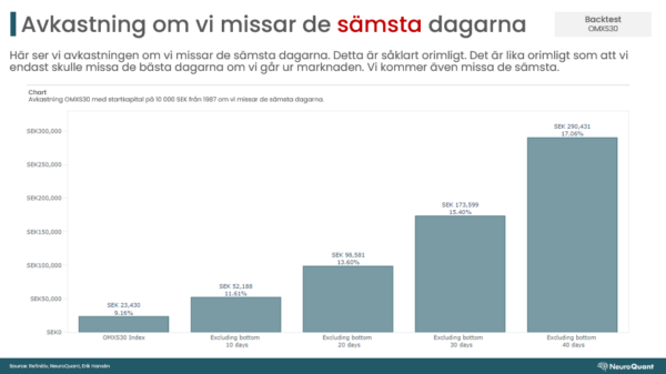 Låt mig förklara vad jag menar. Först kikar vi på hur avkastningen om vi missar de bästa börsdagarna. Som vi ser i grafen förlorar vi en stor del avkastning.